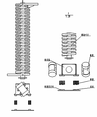 螺旋垂直提升機的驅(qū)動裝置振動電機安裝在輸送塔下部,兩臺振動電機對稱交叉安裝,輸送塔由管體和焊接在管體周圍的螺旋輸送槽組成,輸送塔座于減振裝置上,減振裝置由底座和隔振彈簧組成。當垂直提升機工作時,根據(jù)雙振動電機自同步原理,由振動電機產(chǎn)生激振力,強迫整個輸送塔體作水平圓運動和向上垂直運動的空間復合振動,螺旋槽內(nèi)的物料則受輸送槽的作用,作勻速拋擲圓運動,沿輸送槽體向上運動,從而完成物料的向上(或向下)輸送作業(yè),因此本設(shè)備也被成為振動垂直輸送機。